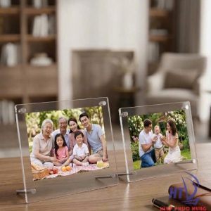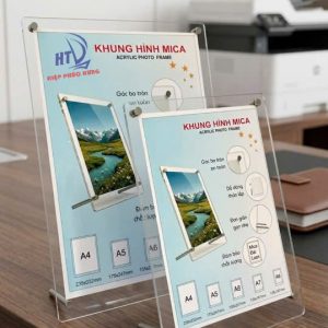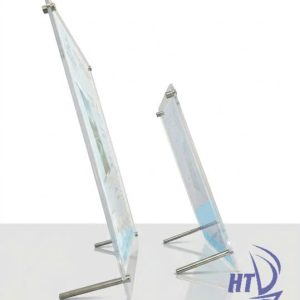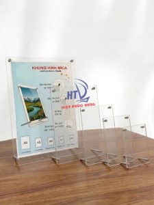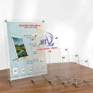 Khung hình mica chân đế inox là loại khung gồm 2 tấm mica trong suốt được cố định bằng ốc/trụ inox cao cấp, phía dưới có chân đế kim loại chắc chắn giúp khung đứng vững trên mặt bàn.