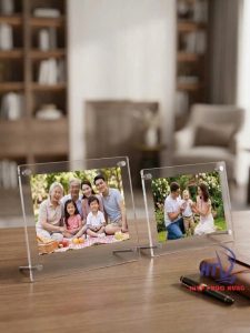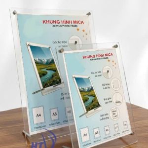 Khung hình mica chân đế inox là loại khung gồm 2 tấm mica trong suốt được cố định bằng ốc/trụ inox cao cấp, phía dưới có chân đế kim loại chắc chắn giúp khung đứng vững trên mặt bàn.